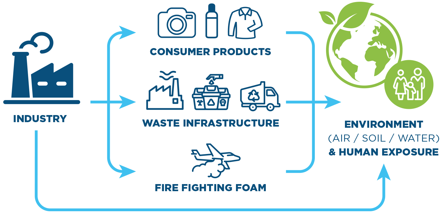 - Liberación inicial: Los PFAS ingresan al medio ambiente desde varias fuentes: